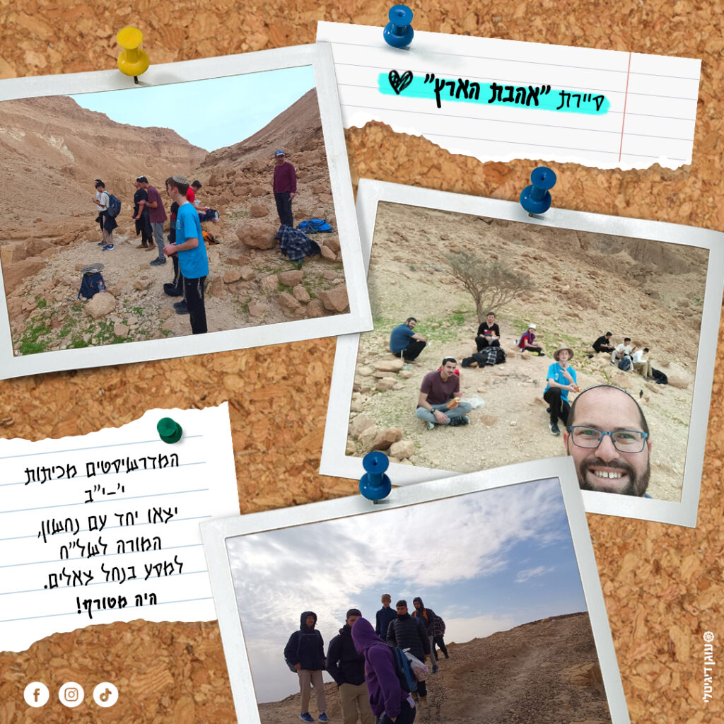 טיול שהתחיל אתמול ונמשך גם היום סיירת ״אהבת הארץ״ של תלמידים נבחרים מהחטיבה העליונה יצאו יחד עם נחשון, המורה לשל״ח, למסע מיוחד של ״אהבת הארץ״ הם ירדו לנחל צאלים ובחלקו אפילו זרמו מים הליכה בטבע, גיבוש וחיבור אמיתי לארץ. לקראת החשיכה המדרשיסטים התמקמו הכינו יחד ארוחת ערב בשטח ובסוף היום ישנו כמו שצריך בלי מזרון, […]