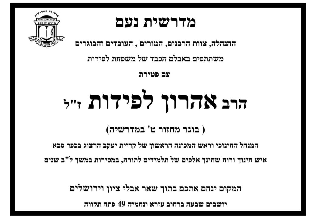 המדרשיה אבלה על פטירת הרב אהרון לפידות ז״ל